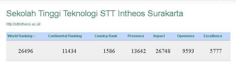 Pemeringkatan Perguruan Tinggi oleh Webometrics ini di diantaranya berdasarkan atas kuantitas dan kualitas content website Perguruan Tinggi, khususnya dokumen-dokumen yang relevan yang dapat diakses oleh publik, seperti misalnya jurnal dan repositori Perguruan Tinggi. Peringkat webometrics yang dicapai STT Intheos Surakarta tentu saja menjadi pendorong untuk semakin meningkatkan kualitas dan kuantitas content ilmiah yang relevan. Diharapkan pada rilis edisi mendatang peringkat tersebut akan mengalami peningkatan.